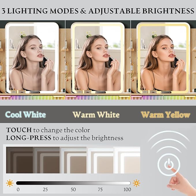 - 【LED Mirror with 3 Light Modes】This makeup vanity desk features a mirror with built-in LED light strip, which is more safe and beautiful than common bulbs. Provide 3 different light modes: warm yellow, natural light and bright white, the brightness is adjustable which can match your different makeup needs