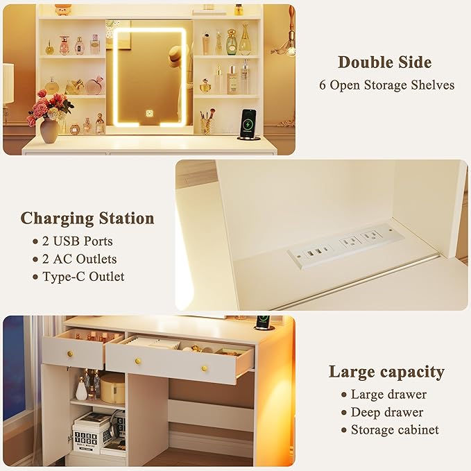 - Efficient Storage Vanity Desk: This vanity with lights (37.4"W x 15.7"D x 53.1"H) boasts a large desktop, 6 open shelves, 2 drawers, and a side cabinet with 2-tier storage. Perfectly organizes all your makeup, skincare, and beauty tools. The LED mirror slides from side to side, and the hidden space behind provides storage for unused items, keeping the countertop tidy