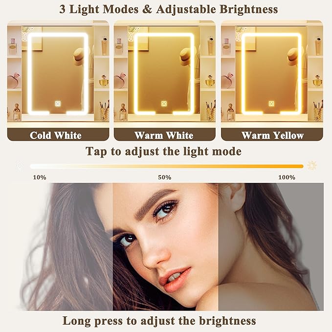 - Vanity with 3-Color Lights Mirror: This vanity desk with mirror and lights features a large HD LED mirror with 3 light modes: Cool White, Warm White, and Warm Yellow. Perfectly adapts to any ambient lighting for the most comfortable and accurate makeup application