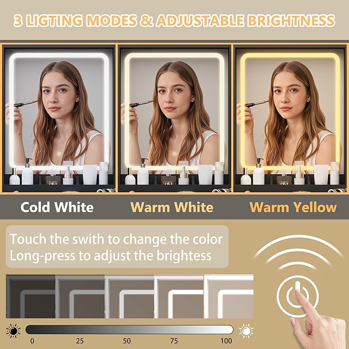 - Vanity Mirror with Lights & Adjustable RGB Ambience: BORNOON makeup vanity desk features a large mirror with three color modes—cool white, warm white, and warm yellow—and adjustable brightness to suit any time of day. RGB lights inside the cabinets add a modern touch and enhance the bedroom vanity experience with stylish ambiance and personalization.