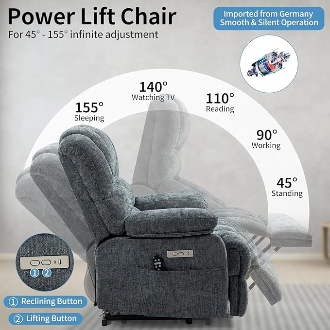 - Full-body Massage & Lumbar Heating: This wide power lift recliner is equipped with 8 vibration points and waist heating points, which massage your lower back through vibration, relieve tension, and promote blood circulation. A fixed time of 10/20/30 minutes provides you with a soothing and therapeutic experience.