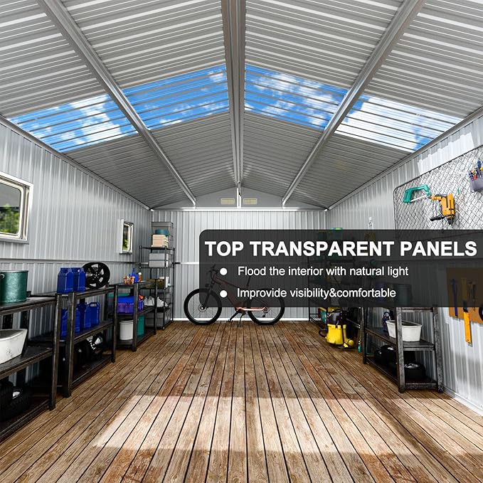 - 【Thoughtful Designs】Metal shed adds 2 transparent roof panels and 2 large windows, will flood the interior with more natural light, improve visibility and air circulation, make you feel comfortable when inside.