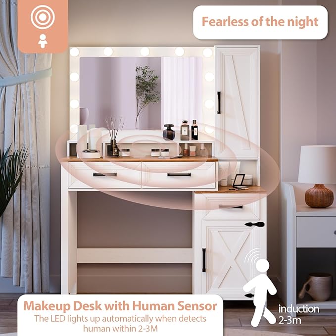 - Square Mirror with Tricolor Lighting: The makeup vanity table features a stylish square mirror surrounded by built-in bulbs that provide three lighting modes—white, yellow, and natural (composite) light