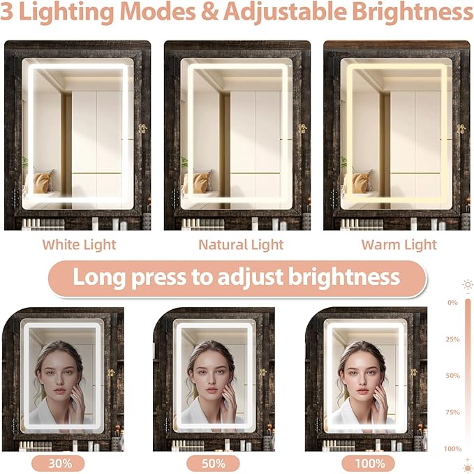 - Human Body Sensing LED Lights: Equipped with user-friendly 3-color LED lights, the brightness can be adjusted from 0% to 100% to suit various makeup needs. The intelligent 360° body-sensing design automatically turns on the lights when someone is within approximately 1 meter, ensuring you always have optimal lighting.