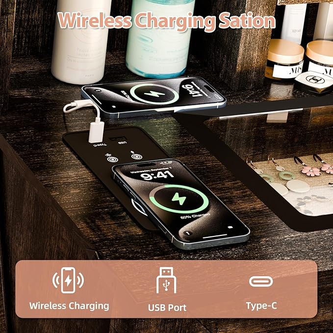 - Multi-Functional Charging Station: This makeup station features a built-in USB port, Type-C port, and wireless charging pad, allowing you to conveniently charge your electronic devices while getting ready. No need to search for separate outlets—this integrated design greatly enhances convenience and efficiency.