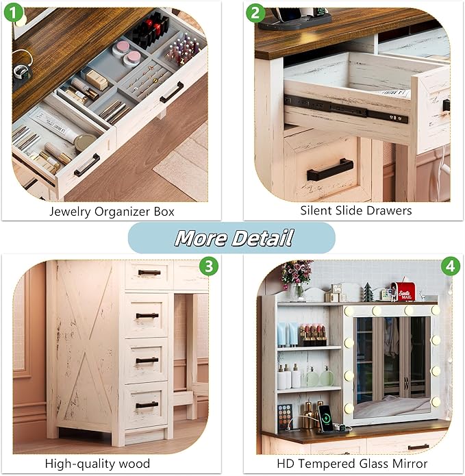 - Built-in Charging Station: The makeup vanity features an integrated charging station, allowing you to conveniently charge mobile phones, tablets, and other electronic devices without needing extra outlets—enhancing overall ease of use.