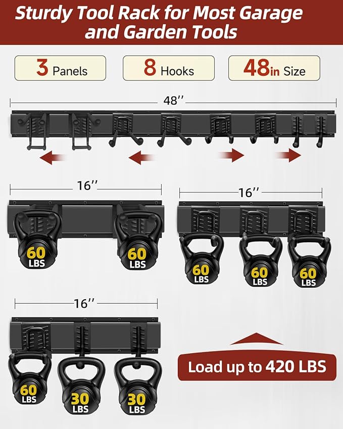 - Package include: Equipped with 8 hooks and 3 rails, this adjustable garden tool holder organizes all your garage / lawn/ garden to save floor space, a must-have for any homeowner looking to streamline their tools and achieve a well-organized space
