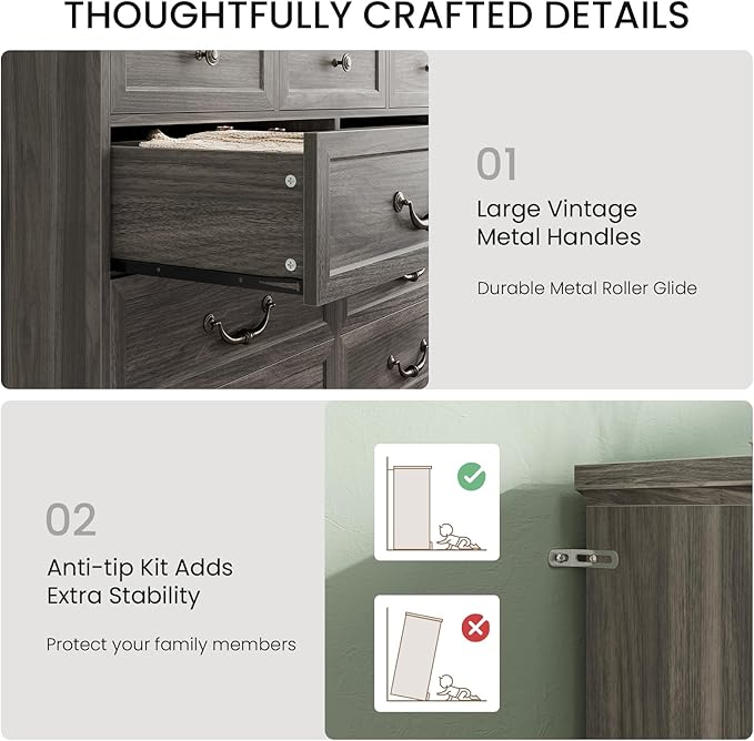 - 【Thick and Sturdy Dresser】Dimensions: 47.24"(L) x 32.3"(H) x 15.94"(D) . DICTAC farmhouse 9 drawers dresser is made of high-quality MDF engineered wood. The thickened top plate and bottom design make this dresser more durable and stable while being scratch-resistant, waterproof and easy to clean. The thickened back panel ensures the privacy of your storage while enhancing stability. Anti-tip kit included to keep your family safe.
