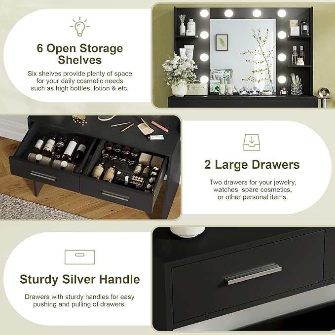 YESHOMY Vanity Desk with Mirror, Makeup Table with 2 Large Drawers, Power Outlet and Round Holder, 3 Color Modes Adjustable Bulb, Pure Black