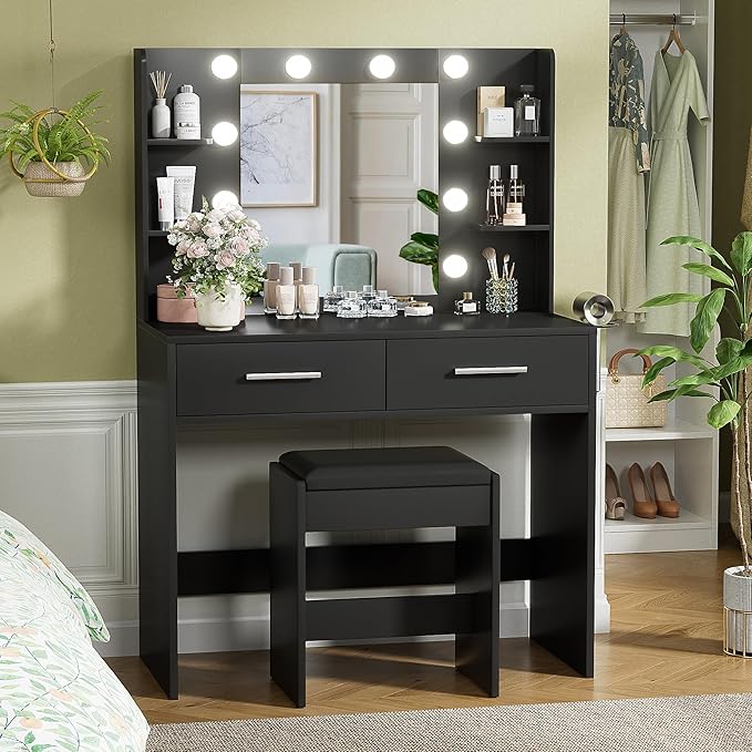 YESHOMY Vanity Desk with Mirror, Makeup Table with 2 Large Drawers, Power Outlet and Round Holder, 3 Color Modes Adjustable Bulb, Bench Included, Pure Black