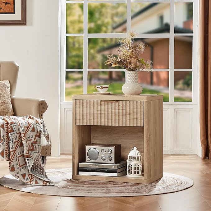 - [LEYAOYAO Versatile Farmhouse Nightstand] Our fluted bedside table boasts a minimalist curve profile and a drawer with a unique waveform panel, which is a perfect blend of modern aesthetics and functional design. The smooth curved edges make your bedroom exude elegance! This night stand can be used not only as a bed side table but also as a living room end table. Add a strong rustic colour to your bedroom and living room.