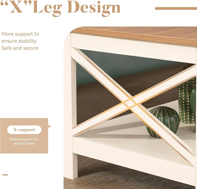 - Sturdy X-Shaped Side Design: The coffee table sides features a robust X-shaped frame for enhanced stability and durability.Its farmhouse-inspired design with ivory white finish and warm wood-toned tabletop, adds rustic charm while effortlessly elevates any room.