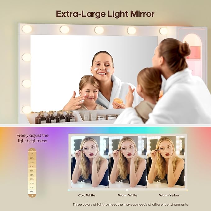 - 【31.5" HD Large Mirror & 3 Colors of Light】Equipped with an extra-large high-definition mirror, allowing you to check your makeup, hairstyle, accessories, and overall outfit from every angle. It can also be used by two people at the same time. 11 Hollywood-style eye-friendly light bulbs provide 3 light colors: cool white, warm white, and warm yellow, and the brightness is adjustable. Meet your makeup needs for different scenarios and say goodbye to color difference embarrassment