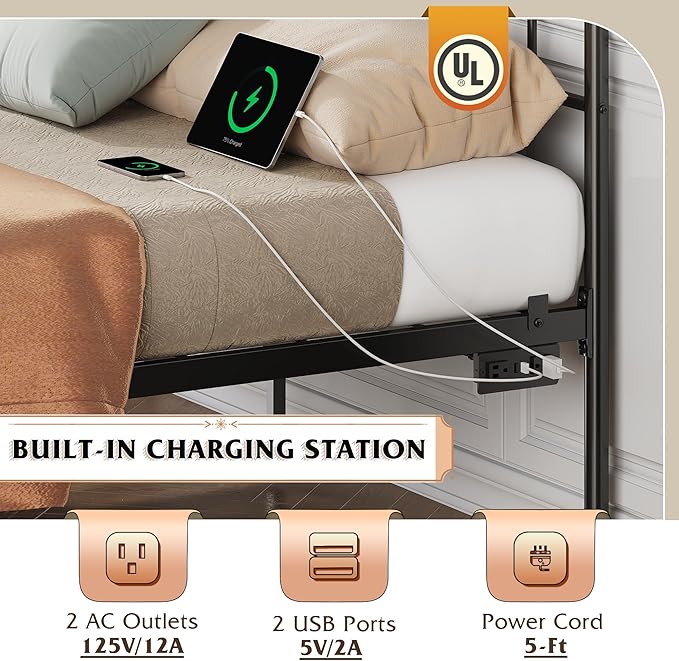 - 【✨ Convenient Charging Station】Say goodbye to low battery anxiety! The full bed is equipped with 2 AC sockets +2 USB ports, 1.5m flexible cable length, Mobile phones, tablets, game consoles can be done, through UL/ETL certification, electricity safety!