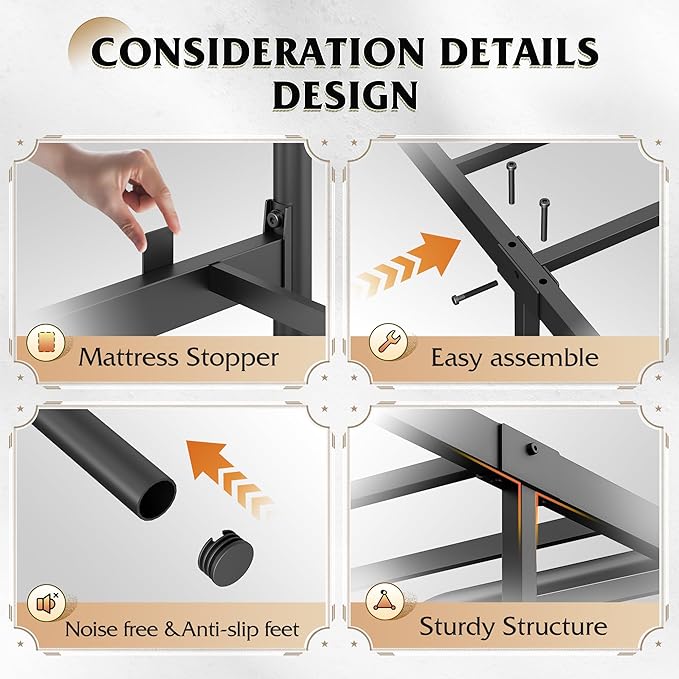 - 【✨ Sturdy and Safe】This bed frame full size features rounded corners, a smooth surface and 3M anti-slip pads on the legs to prevent the bed from sliding. The bed frame is made of 11 high-quality metals and sturdy steel legs, and can bear a load of up to 1500 pounds.