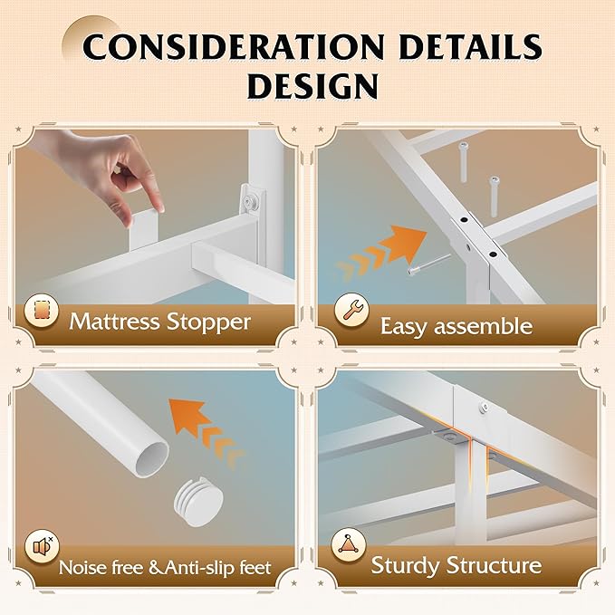 - 【✨ Sturdy and Safe】This queen bed frame features rounded corners, a smooth surface and 3M anti-slip pads on the legs to prevent the bed from sliding. The bed frame is made of 11 high-quality metals and sturdy steel legs, and can bear a load of up to 1500 pounds.