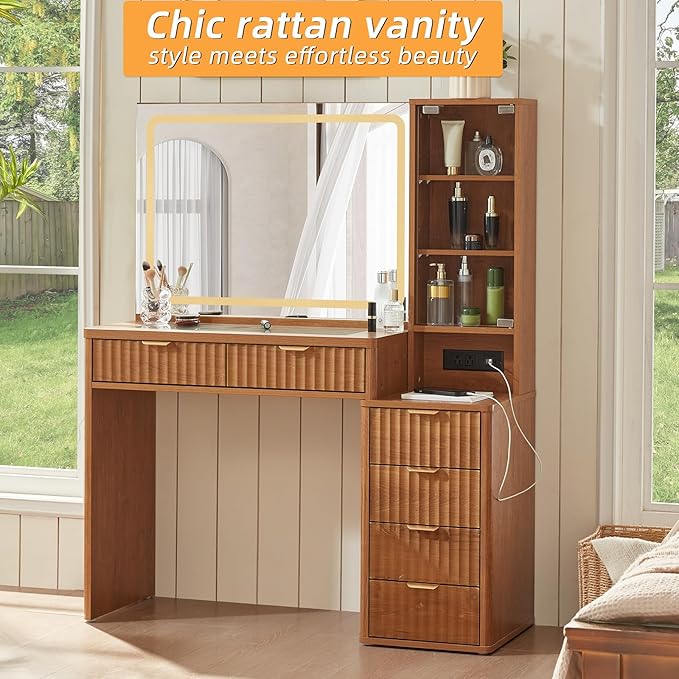 - Fluted Vanity Desk : The makeup vanity features an exquisite groove texture, exuding a premium feel.With a large mirror and adjustable lighting, this fluted-style makeup vanity looks flawless from every angle. The built-in charging station allows every woman to style herself while watching her favorite shows. The light from the illuminates the HD tempered glass surface, making your watches and jewelry in the drawers sparkle brilliantly.
