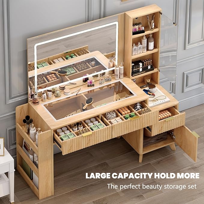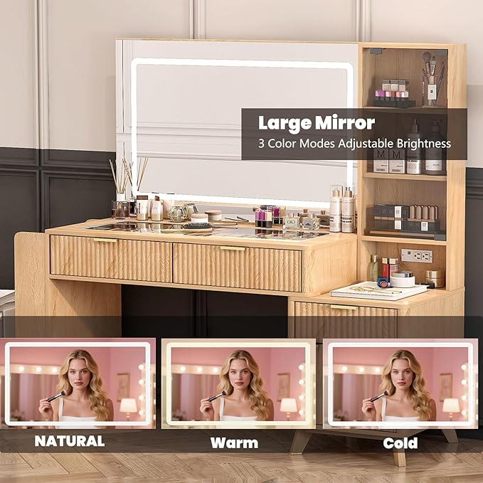 52" Fluted Vanity Desk with Large 34" Mirror and Lights 3 Colors, Big Makeup Vanity Desk with Transparent Top & Power Outlet, Dressing Table with Drawers, Side Cabinet, Dresser for Bedroom (Oak)