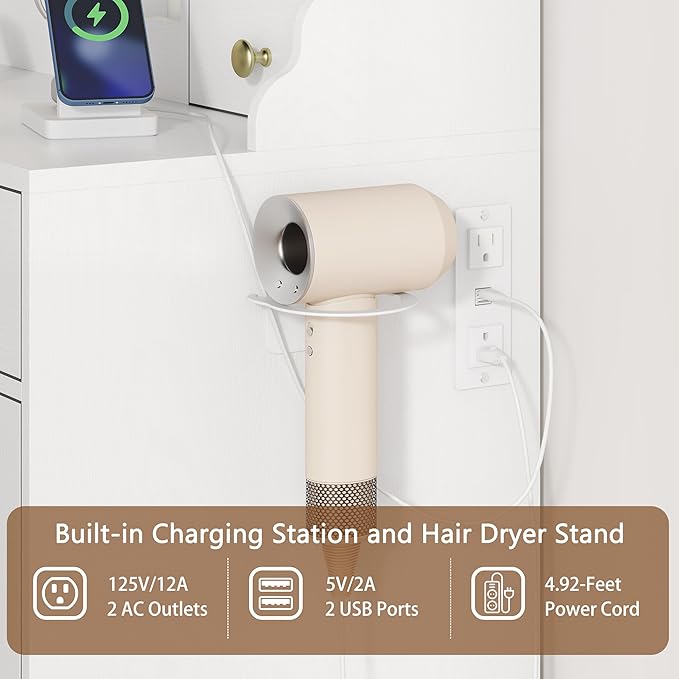 - 【BUILT-IN CHARGING STATION】Vanity mirror with lights desk features the built-in power strip with 2 outlets and 2 USB ports, you can use eazily of curling irons, hair dryers, and phone charging. Unique hair dryer rack on the right is more convenient for you to use hair tools , so you don't worry again about too hard to find it when dressing table turning off the lights.