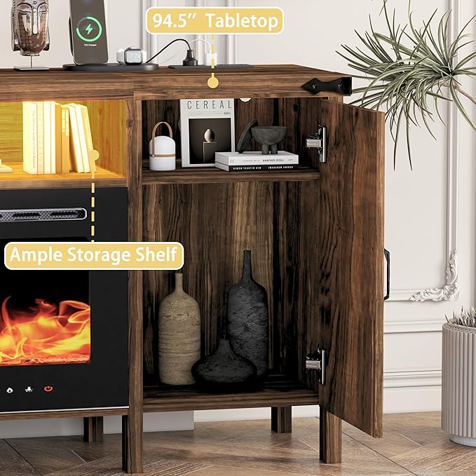 - Charging Station and LED Lights: The fireplace TV stand built-in 2 power outlets and 3 USB ports, which can charge mobile phones, tablets and other electronic devices. The fireplace comes with LED light strips, which can matched with the color of the fireplace flame to enhance the night atmosphere