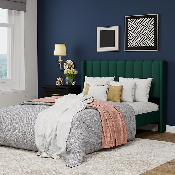 Upholstered Platform Full Size Bed Frame with Headboard Wooden Slats Support No Noise Easy Assembly Green Velvet