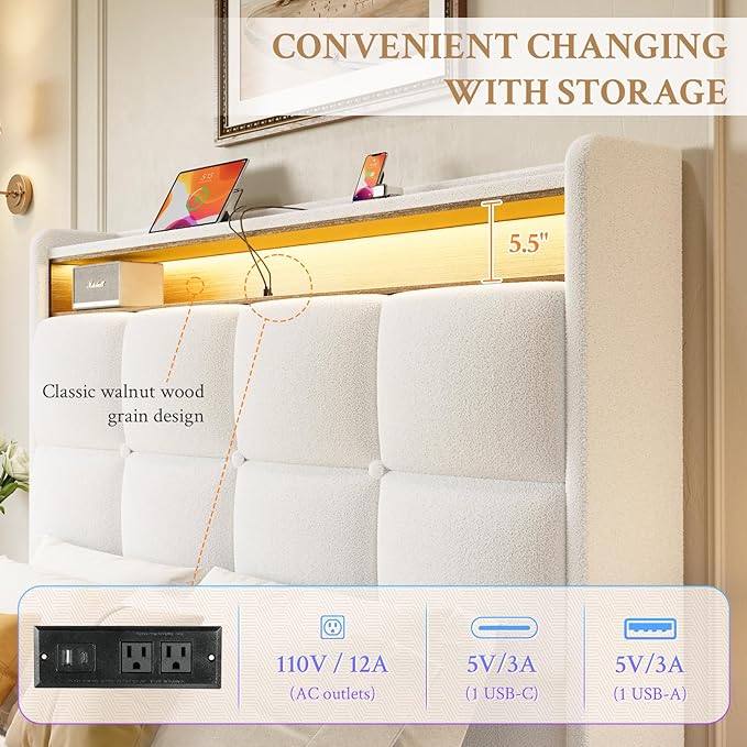 - Special Feature : 51" Tall Teddy Fleece Headboard, Deep Button Tufted Wingback Upholstered, Large Capacity Double Storage Shelf, Sturdy Noise-Free Structure and No Box Spring Required, USB/Type-C Port and Colorful LED Lights 51" Tall Teddy Fleece Headboard, Deep Button Tufted Wingback Upholstered, Large Capacity Double Storage Shelf, Sturdy Noise-Free Structu… See more