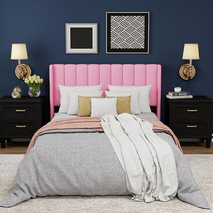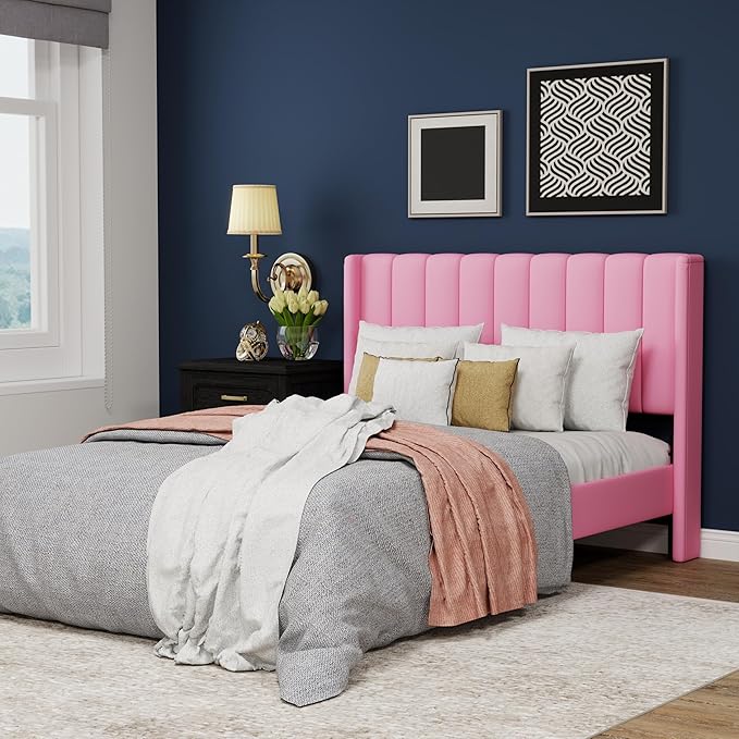 Upholstered Platform Full Size Bed Frame with Headboard Wooden Slats Support No Noise Easy Assembly Pink Velvet