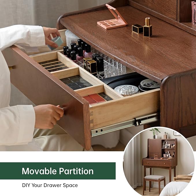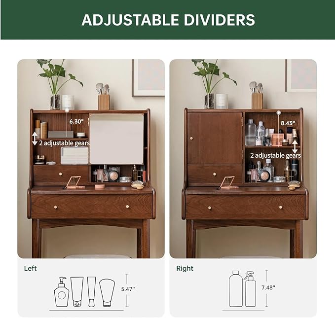 - đăAdjustable cabinet dividersăBoth the door cabinets above the vanity table and the dividers inside the drawers are adjustable to cosmetic sizes. The ultimate in organizing your skincare products without wasting space.