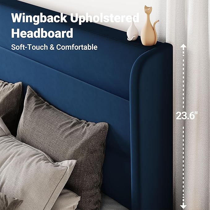 Allewie Queen Size Platform Bed Frame with Velvet Upholstered Wingback Headboard, No Box Spring Needed, Under Bed Storage Space, Wooden Slats, Modern Mattress Foundation, Easy Assembly, Blue