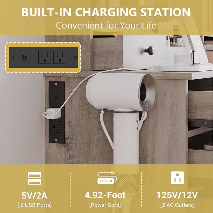 - 【Built-in Charging Station & Hair Dryer Rack】The modern vanity comes with a power strip, including 2 AC outlets and 2 USB ports, through which you can charge and use electronic devices at the same time. In addition, our vanity desk provides you with a hair dryer rack to keep your hair dryer and hair curler within arm’s reach
