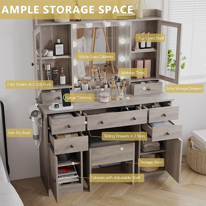 - 【Powerful Storage Capacity】 The size of the vanity desk with mirror is 43.7×15.55×57.28 inch/ 111×39.5×145.5 cm(L×W×H) and weighs 109 lbs/ 49.25kg. The makeup vanity is combined by SEVEN parts: 2+4+1 drawers, 2 glass door cabinets, 2 cabinets with adjustable shelves, 3 makeup trays, a open storage area, a wide desktop and a cushioned stool. It can help you to classify and store your items, so that you will have a tidy and clean room