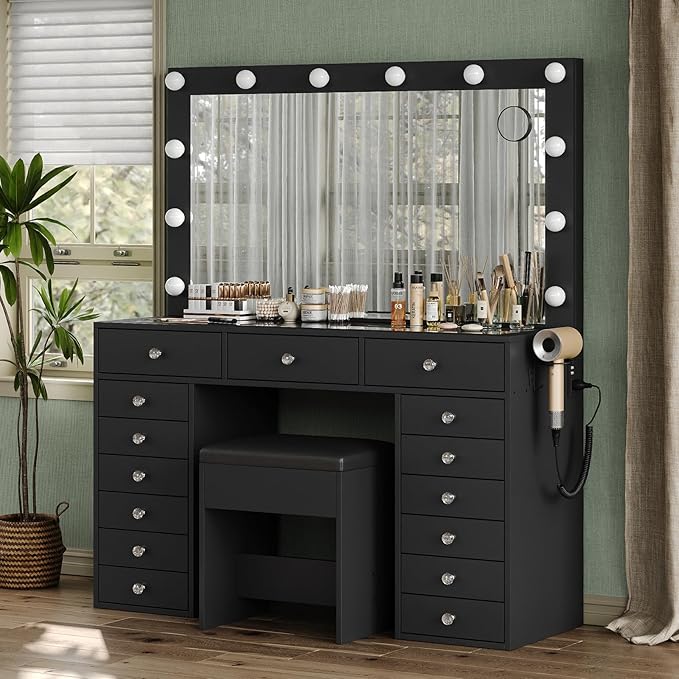 15 Drawers Makeup Vanity with Charging Station, Vanity Desk with 12 LED Bulbs and HD Mirror, 3 Color Brightness Adjustable, Vanity Set for Bedroom, Black