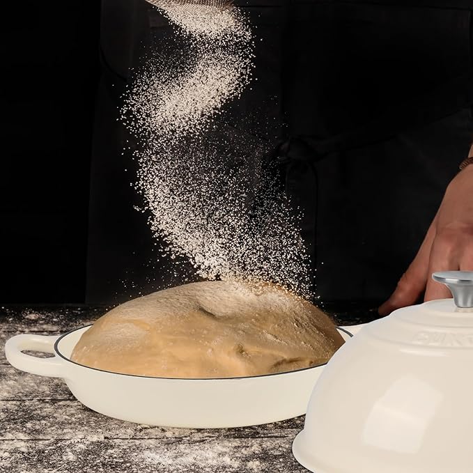 - 【Thoughtful Design】 Ergonomic handles for a secure grip and easy handling, even with oven mitts. While remaining cool enough to touch briefly when moving the cast iron dutch oven pot. The pan's balanced weight distribution makes handling safer, while the flared edges prevent dough from sticking to the sides during rising. For models including a lid, the tight-fitting design traps steam to create the perfect crust on artisan breads