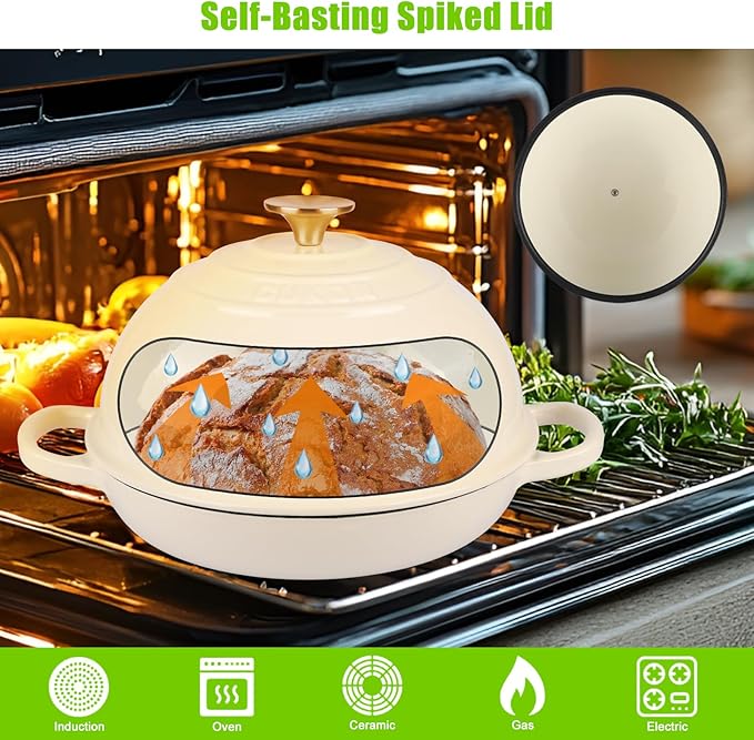 - 【Versatility】 Beyond baking, our dutch oven bread pot with lid perfect for braising, frying, roasting, and stovetop-to-oven recipes—truly multi-functional. Compatible with gas, electric, induction, and oven use up to 500°F. This versatility replaces several single-purpose pans, saving storage space and simplifying your cooking process