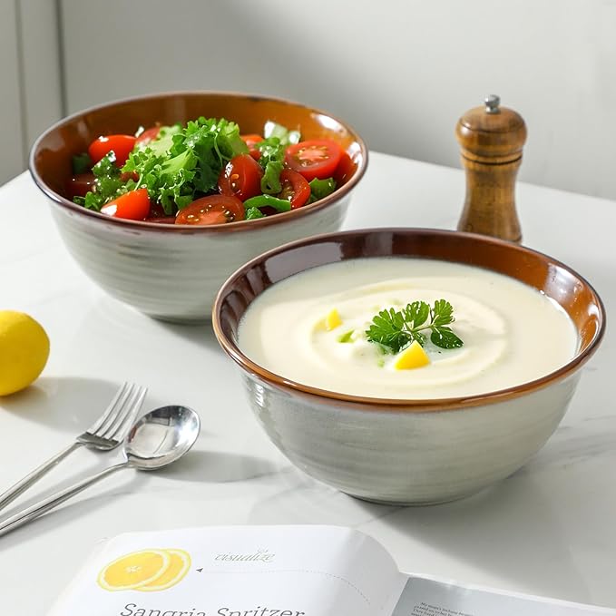 - Elegant Vintage Brown Finish:Featuring a warm vintage brown glaze, these ceramic serving bowls offer a classic, earthy look that adds rustic charm to everyday meals and special gatherings, The bowl is brown on the inside and grey with brown stripes on the outside