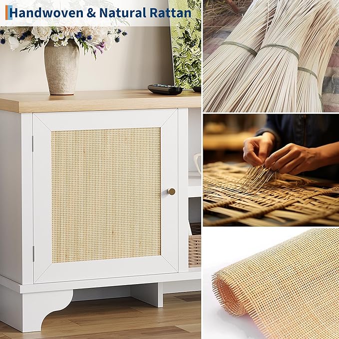 - Natural Farmhouse Charm with Rattan Doors: This TV stand features two beautifully woven rattan doors, bringing a touch of nature and warmth to your living room decor. The farmhouse-inspired design easily complements a variety of interior styles