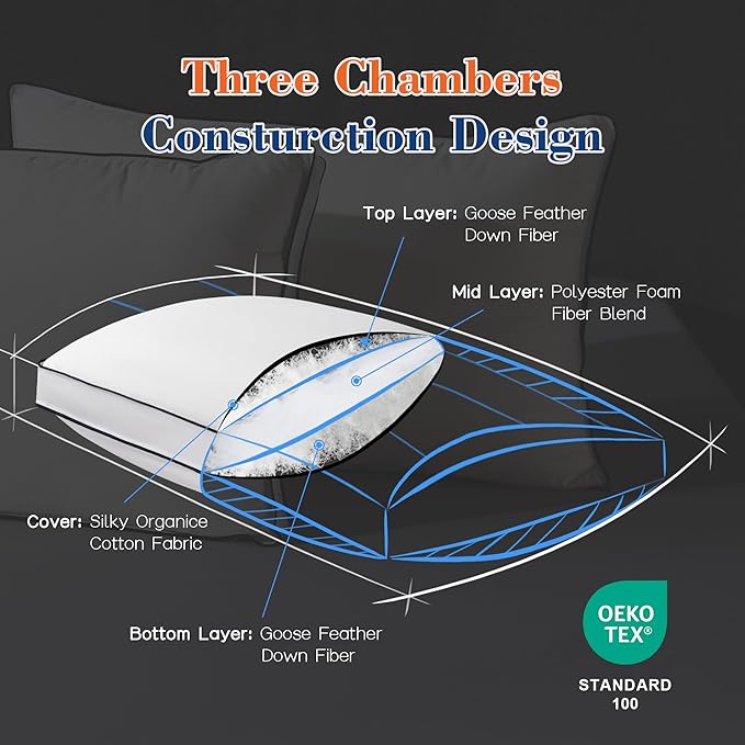 - Perfect Support and Comfort- The bedding pillow designed with amazing 3-Chamber- The inner layer uses 80% polyurethane foam+20% polyester fiber blend, The top and bottom layer uses white goose down fiber, This combination provides the balance between support and comfort for your head and neck., giving you better relaxation and improved sleep!