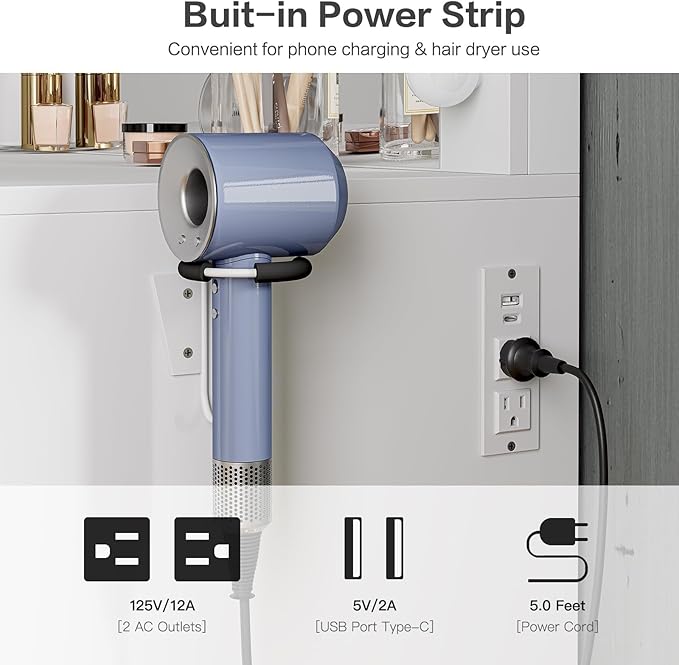 - Built-in Power Outlet: The vanity comes with a hair dryer stand with a built-in power outlet; The built-in charging station includes 2 standard plug sockets and 1 USB ports and 1 Type-C to connect your hair dryer, curling iron, computer, cell phone, ipad and other devices, so that all activities can be carried out on this vanity table