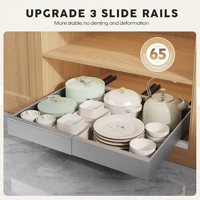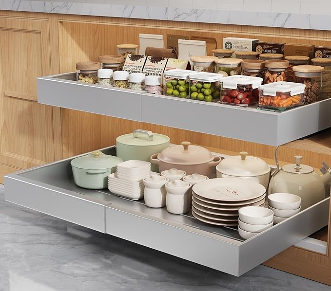 - Customizable Width Expansion:Adjustable from 15.2" to 26.3", this pull out drawer fits a wide range of cabinet sizes. Ideal for organizing heavy pots, rice cookers, bakeware, bowls, spice jars, and packaged food. Customizable Divider Racks: Comes with four adjustable divider racks that can be positioned to match your storage needs. Whether organizing pots, pans, spices, or canned goods, these dividers keep everything secure and within reach.