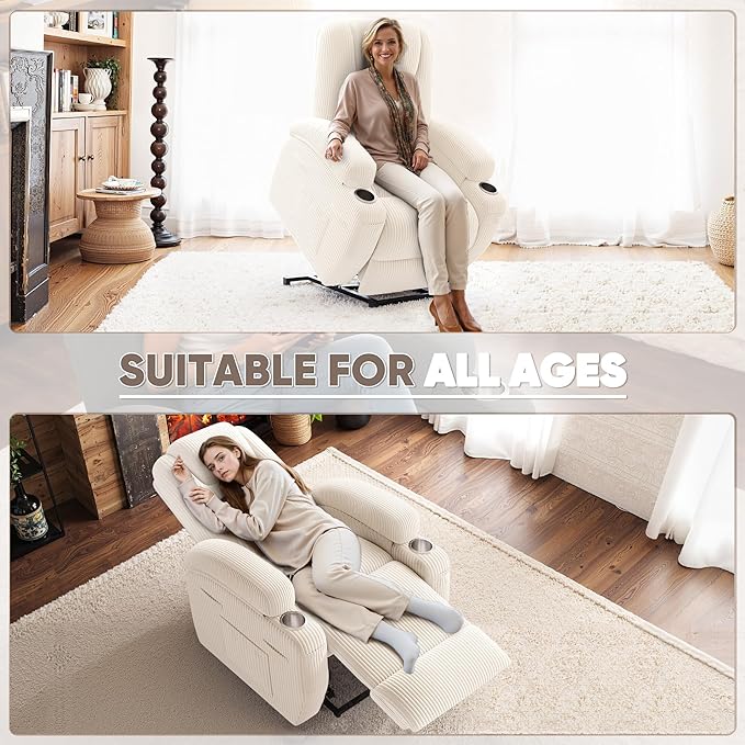 Power Lift Recliner Chair with Massage Electric Lift Chair for Elderly, Ergonomic Recliner with Cup Holders & Side Pockets, Modern Single Sofa for Living Room (Corduroy, White)