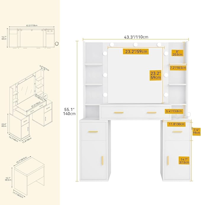 - Everything in Its Place: Your beauty collection deserves more than a drawer. With 6 open shelves, 2 drawers, and 2 cabinets, your makeup, skincare, and perfumes all have a home. Plus, the cushioned stool offers hidden storage for tools or secret snacks