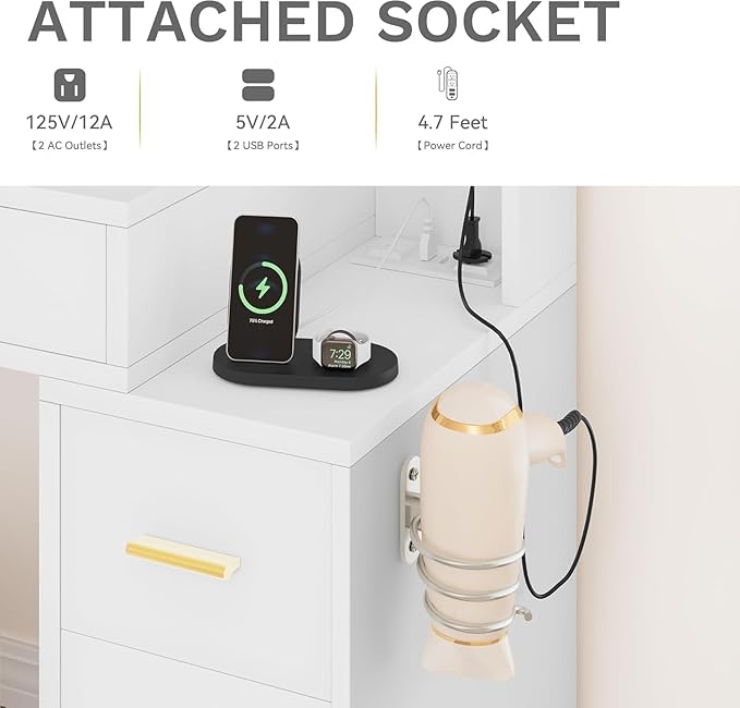 - Handy Charging & Hairdryer Holder: Forget hunting for outlets. With 2 outlets, 2 USB ports, and a handy hairdryer holder, your vanity desk keeps everything organized. Charge your phone, style your hair, and stay neat, it’s your own little command center
