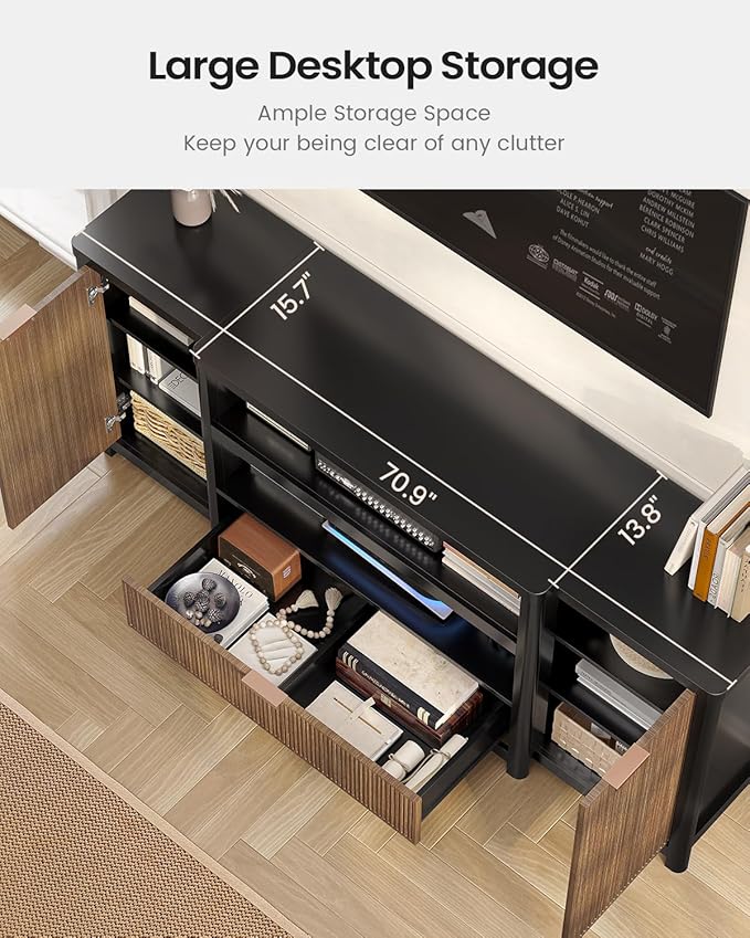 - 【Ample Storage Space】This spacious TV console delivers smart storage with 2 cabinets, 1 drawer, and 2 open shelves - all designed to organize your entertainment essentials. The open shelves customize perfectly for game consoles, media players, or decorative items, while the discreet rear cable hole keeps wires neatly tucked away. With its generous storage capacity and clutter-free design, this stand keeps your living room looking tidy while accommodating everything from soundbars to DVD collections.