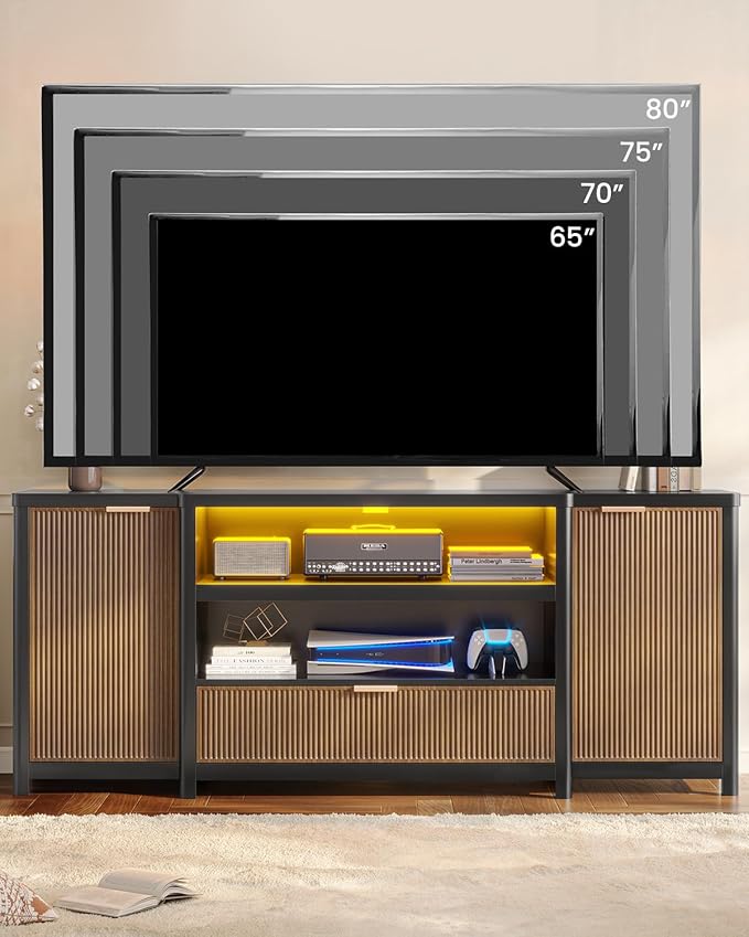 - 【Accommodates TVs up to 80 Inches】This fluted tv stand is thoughtfully designed, measuring 71" width and 31.5" height, to accommodate TVs ranging from 50 to 80 inches. Its sizing ensures compatibility with various television models.Built with ultra-thick Exterior Grade MDF Board, net weight 105 pounds, gross weight 113.5 pounds, ensuring durability and luxurious enjoyment.