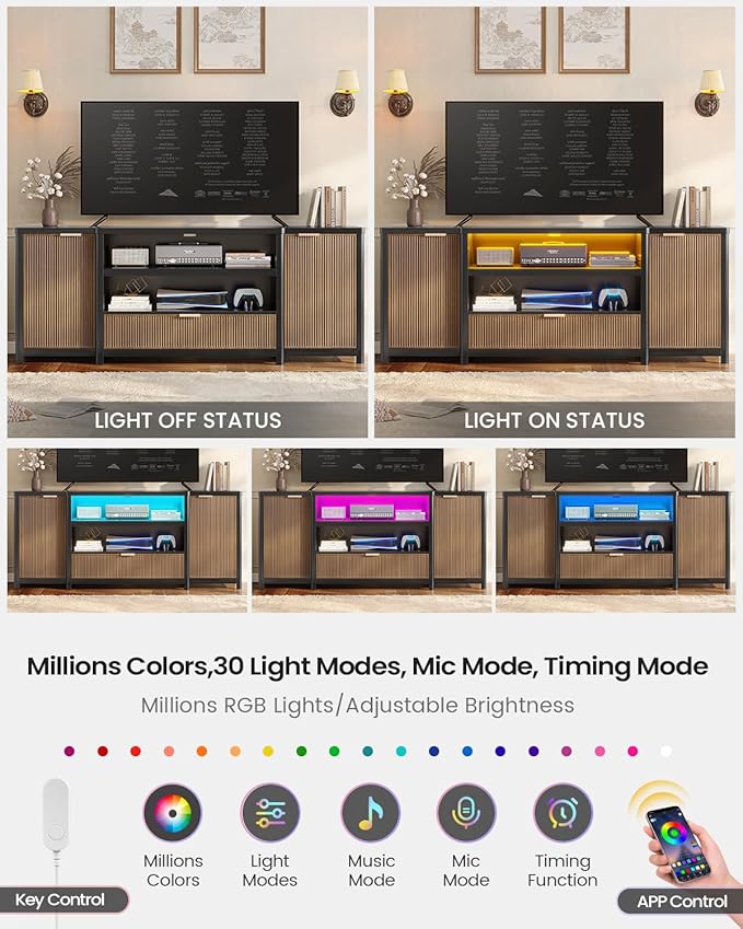 - 【Multi-Function Led Light】The TV stand for living room with beautiful multi-color Led light strips, you can set the light, colors, mode, timing mode, music mode by APP/remote controller. The light and color also can be changed with the music rhythm and creating a romantic atmosphere for your bedroom.