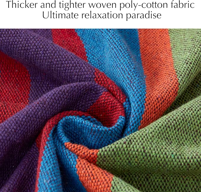 - đź’šPORTABLE OUTDOOR & INDOOR HAMMOCK: Whether you're sipping on a refreshing beverage or curled up with a good book. It is guaranteed to provide lots of relaxation. Our polycotton hammock is perfect for indoor or outdoor covered use and adds a relaxed feel and a luxurious look to your space. It can be used with a 9ft hammock stand or hung from a coconut tree