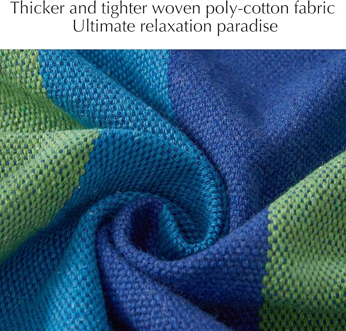 - đź’šULTIMATE COMFORTABLE FABRIC: Quality woven polycotton is stronger than 100% cotton. By using polyester fibers, the hammock stretches out less. The hammock also retains its shape better when there has been a rain shower.
