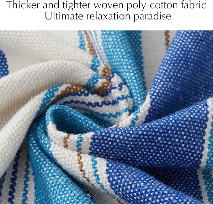 - đź’šULTIMATE COMFORTABLE FABRIC: Quality woven polycotton is stronger than 100% cotton. By using polyester fibers, the hammock stretches out less. The hammock also retains its shape better when there has been a rain shower.