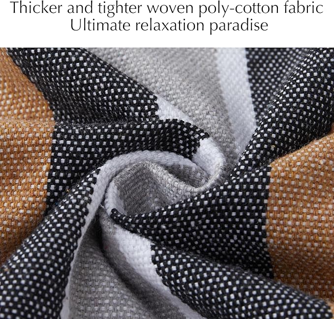 - đź’šULTIMATE COMFORTABLE FABRIC: Quality woven polycotton is stronger than 100% cotton. By using polyester fibers, the hammock stretches out less. The hammock also retains its shape better when there has been a rain shower.