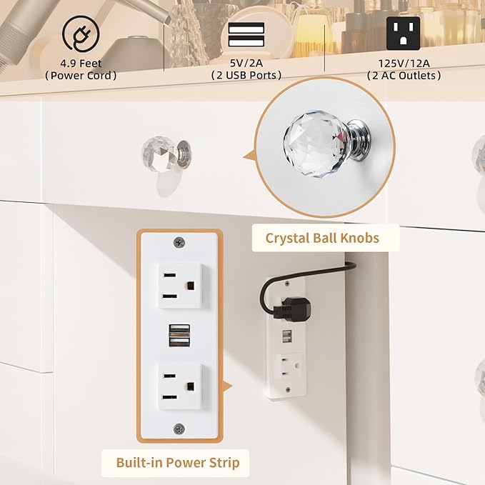 - Convenient Charging Station: Equipped with 2 standard plug sockets and 2 USB ports, this makeup desk allows for easy charging of hair dryers, curling irons, beauty devices, and phones.